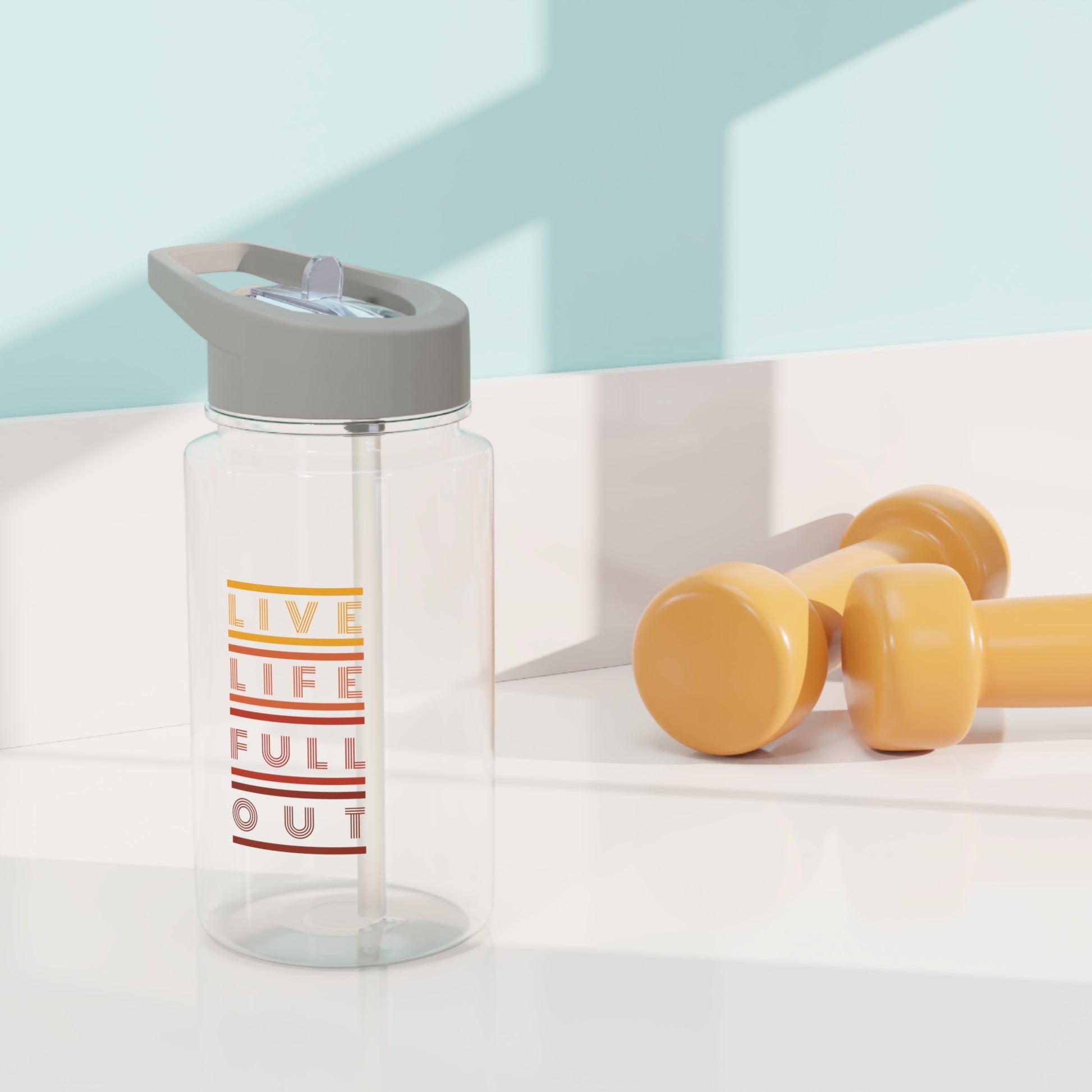 - COLORS - transparent bottle, white top, with custom red ombre Live Life Full Out! logo